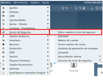 - En el menú principal de SAP Business One, versión para SAP HANA, seleccione Socios de Negocio > Datos maestros Socio de Negocio.