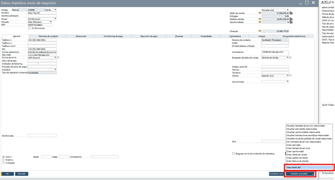 2. En la ventana Datos maestros Socio de Negocio, vaya a un cliente y, en la esquina inferior derecha, seleccione También es posible > Vista cliente 360