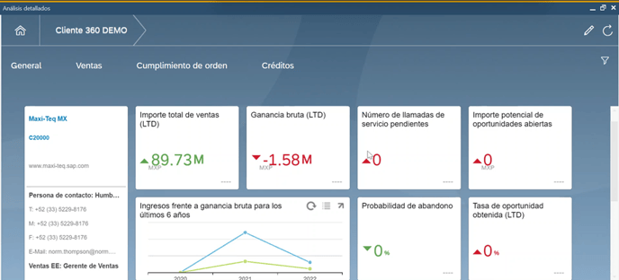 Es un panel de análisis avanzado que muestra en una sola pantalla múltiples aspectos relacionados con un cliente específico. Está diseñado para áreas como ventas, cobranza y atención al cliente, con información visual e interactiva.